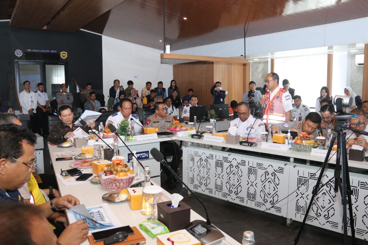 Kapolda Sumsel Irjen Pol Andi Rian R Djajadi SIK,MH bersama Penjabat (Pj) Gubernur Sumatera Selatan (Sumsel) Elen Setiadi, S.H., M.S.E mengikuti Rapat Evaluasi Natal Tahun 2024 dan Tahun Baru 2025 serta Koordinasi dan Antisipasi Isu Strategis Transportasi di Provinsi (Sumsel) dalam rangka Persiapan Angkutan Lebaran Tahun 2025 bertempat di Ruang Command Center BPTD Kelas II Sumatera Selatan Terminal Tipe A Alang Alang Lebar Palembang, Kamis (2/1/2025).